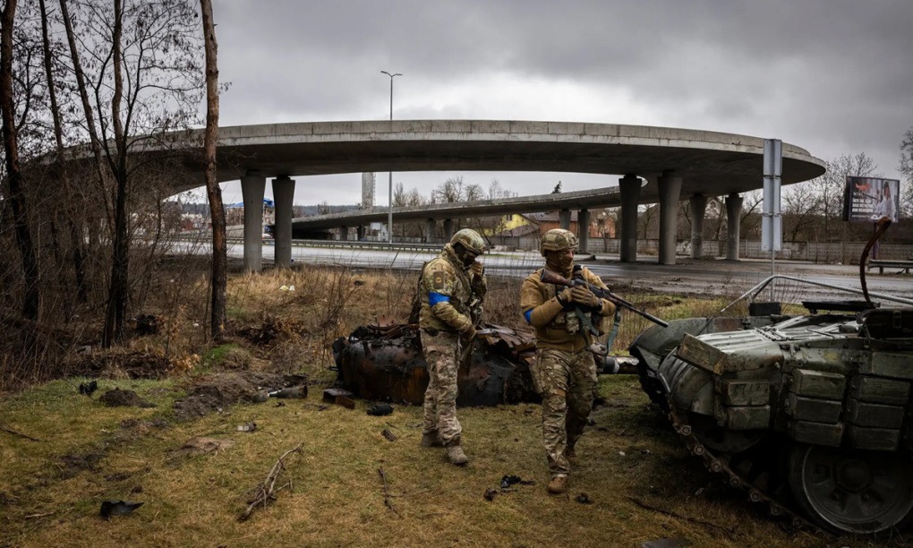 Hai lính Ukraine đứng cạnh một phương tiện quân sự bị hỏng ở ngoại ô Kiev hôm 2/4. Ảnh: NY Times.