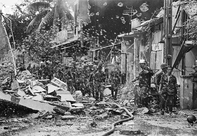 Lính Mỹ thuộc Sư đoàn bộ binh số 9 tác chiến trên đường phố Sài Gòn, trong chiến sự Mậu Thân 1968. Ảnh: Philip Jones Griffiths/Magnum.