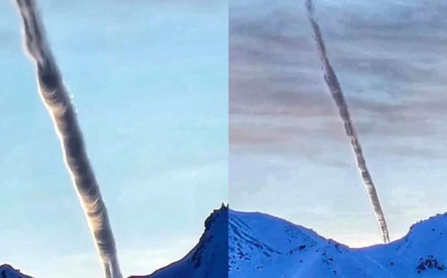 Theo Daily Mail, đám mây kỳ lạ giống một con sâu khổng lồ "bò" từ trên trời xuống núi Lazy ở Alaska, làm dấy lên các thuyết âm mưu - từ tai nạn máy bay đến UFO, hay một vụ thử vũ khí tối mật.