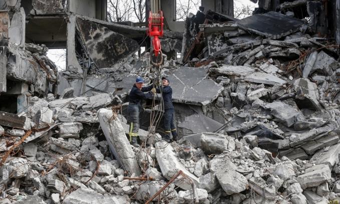 Nhân viên ứng phó khẩn cấp tại tòa nhà đổ nát ở Mariupol, Ukraine, hôm 10/4. Ảnh: Reuters.