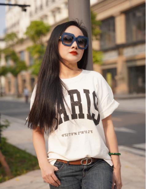Mới đây, trên trang cá nhân của mình nữ BTV tung ra những bức ảnh với phong cách street-style khỏe khoắn. Cô diện chiếc áo phông rộng màu trắng có họa tiết chữ ở phía trước mix với quần jean truyền thống.