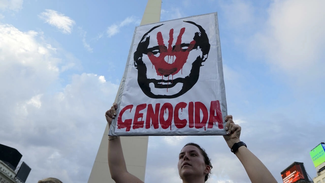 Một người biểu tình trương biển tố cáo tổng thống Nga "diệt chủng" tại Ukraina. Buenos Aires, thủ đô Achentina, ngày 06/03/2022. AP - Natacha Pisarenko
