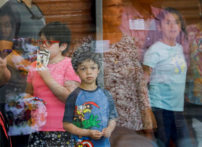 Đứa trẻ nhìn từ cửa sổ trong Trung tâm Hành chính Uvalde, sau khi được chuyển đến từ trường tiểu học. Ảnh: Reuters.