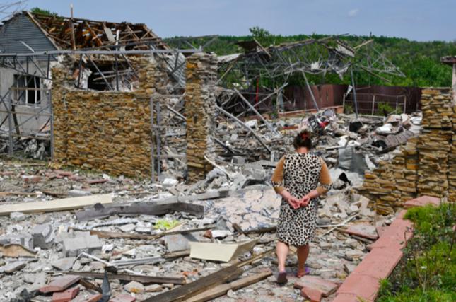 Một phụ nữ đi trong khu nhà đổ nát ở Sloviansk ngày 1/6. (Ảnh: AP)