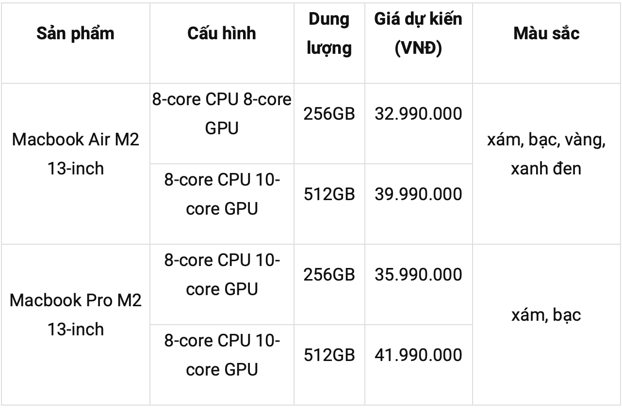 Nếu không có ǵ thay đổi th́ MacBook Air M2 và MacBook Pro M2 chính hăng mới nhất sẽ được lên kệ vào khoảng thời gian cuối tháng 7.2022 tại Việt Nam. Giá bán chính hăng của từng sản phẩm được dự đoán như sau: