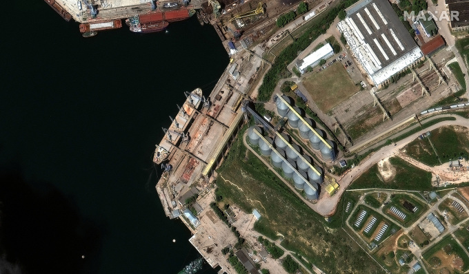 Ảnh vệ tinh cho thấy ngũ cốc được chất lên tàu chở hàng ở cảng Sevastopol, Crimea hôm 18/5. Ảnh: Maxar.