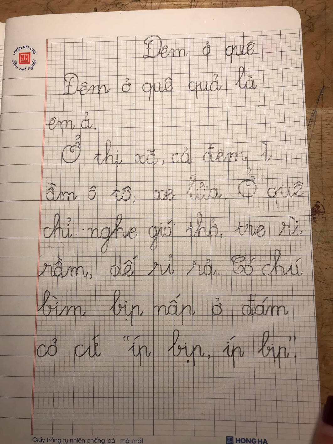 Bài văn có tiêu đề nghe rất mĩ miều: "Đêm ở quê". Tuy nhiên bài văn lại có nội dung như sau: "Đêm ở quê quả là êm ả. Ở thị xã, cả đêm ì ầm ô tô, xe lửa. Ở quê chỉ nghe gió thở, tre rì rầm, dế rỉ rả. Có chú bìm bịp nấp ở đám cỏ cứ "íp bịp, íp bịp"".