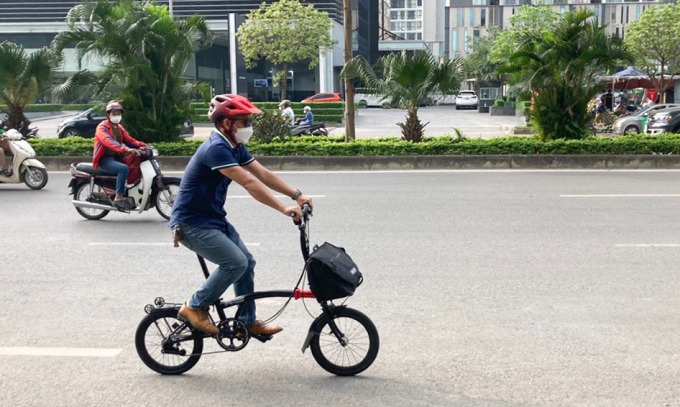 7h sáng mỗi ngày, anh đạp xe từ nhà ở quận Hoàn Kiếm đến chỗ làm ở quận Tây Hồ. Quãng đường hơn 5 km, nhưng lợi thế xe nhỏ gọn, dễ luồn lách, anh ít khi gặp tắc đường, thậm chí có thể đến công ty sớm hơn 10 phút so với ngày đi xe máy.