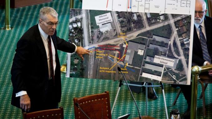 Trong phiên điều trần, ông đă nêu những mốc thời gian quan trọng của vụ xả súng trường tiểu học Robb, đưa ra những chi tiết mới như sĩ quan chờ đợi lấy ch́a khóa mở cửa lớp học nơi tay súng đang ẩn nấp, dù lớp học không thể khóa từ bên trong.
