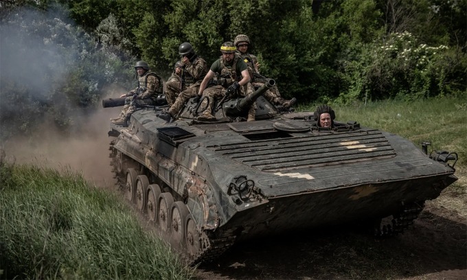 Binh sĩ Ukraine trên thiết giáp di chuyển ở khu vực gần Severodonetsk và Lysychansk ngày 1/6. Ảnh: NY Times.