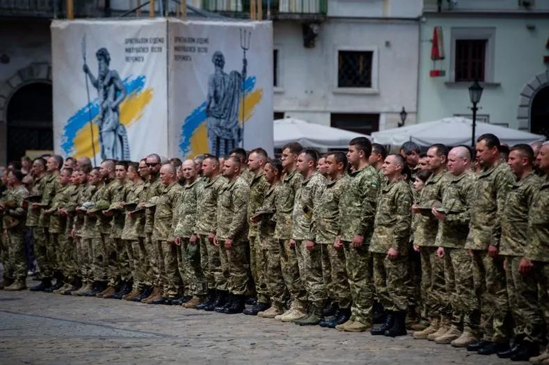 Quân đội Ukraine xếp hàng trước Tòa thị chính ở Lviv, Ukraine ngày 18/6/2022. Ảnh Getty