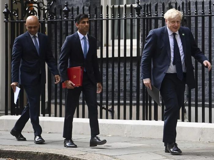 Bộ trưởng tài chính Rishi Sunak và Bộ trưởng Y tế và Chăm sóc xă hội Anh Sajid Javid và Thủ tướng Boris Johnson. Ảnh: AP.