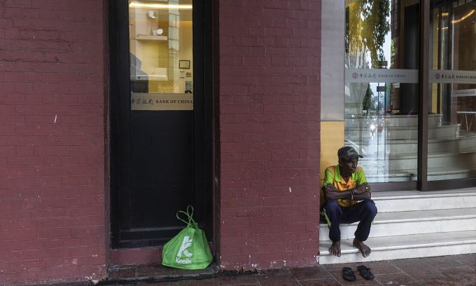 Một người vô gia cư ngồi trước chi nhánh ngân hàng Trung Quốc ở thủ đô Colombo, Sri Lanka. Ảnh: WSJ.