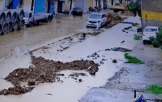 Sự việc xảy ra vào ngày 14/7 vừa qua, trên một con đường ở thành phố Lâm Nghi, tỉnh Sơn Đông, Trung Quốc. Lúc này trời lác đác vài hạt mưa, một bé trai đội ô đi bộ sang đoạn đường bị ngập nước. Có lẽ em nghĩ vũng nước không sâu lắm nên đã thản nhiên bước tới.