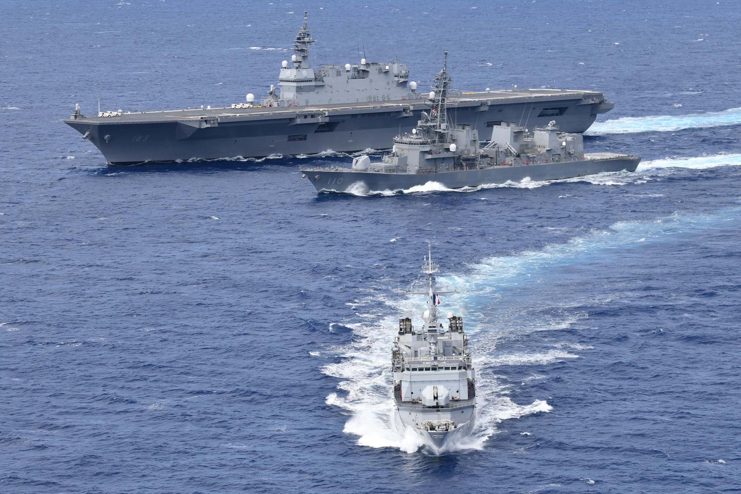 Tàu sân bay trực thăng Izumo (DDH-183) và khu trục hạm Takanami (DD-110) của Nhật Bản diễn tập trên biển với khinh hạm Prairial (F-731) của Pháp - Ảnh: BỘ QUỐC PH̉NG PHÁP