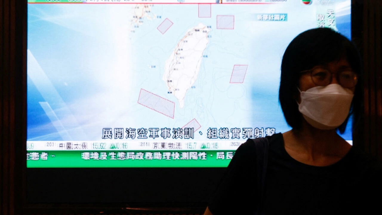 Màn ảnh truyền hình chiếu cảnh quân đội Trung Quốc tập trận ở vùng eo biển Đài Loan ngày 04/08/2022. REUTERS - TYRONE SIU