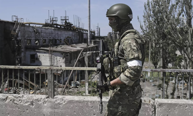 Quân nhân Nga tuần tra tại khu vực nhà máy gang thép Azovstal ở thành phố Mariupol, miền nam Ukraine ngày 13/6. Ảnh: RIA Novosti.