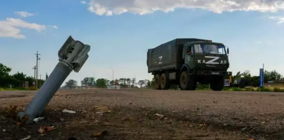 Một chiếc xe tải quân sự của Nga vượt qua một quả bom chưa nổ trong cuộc xung đột Ukraine-Nga tại ngôi làng Chornobaivka, Ukraine, ngày 26 tháng 7 năm 2022 do Nga kiểm soát. Ảnh Reuters.