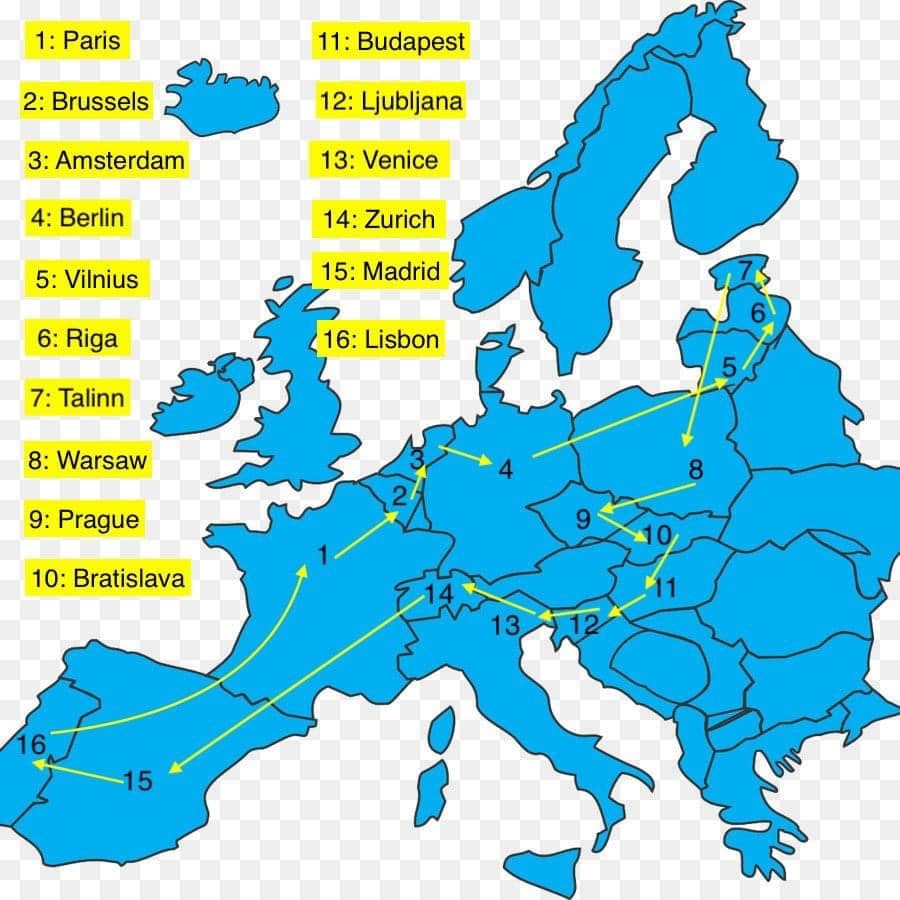 Quãng đường Đông đã đi qua 15 nước, khởi hành từ Paris, và kết thúc ở Lisbon, rồi quay về Paris. Ảnh: NVCC