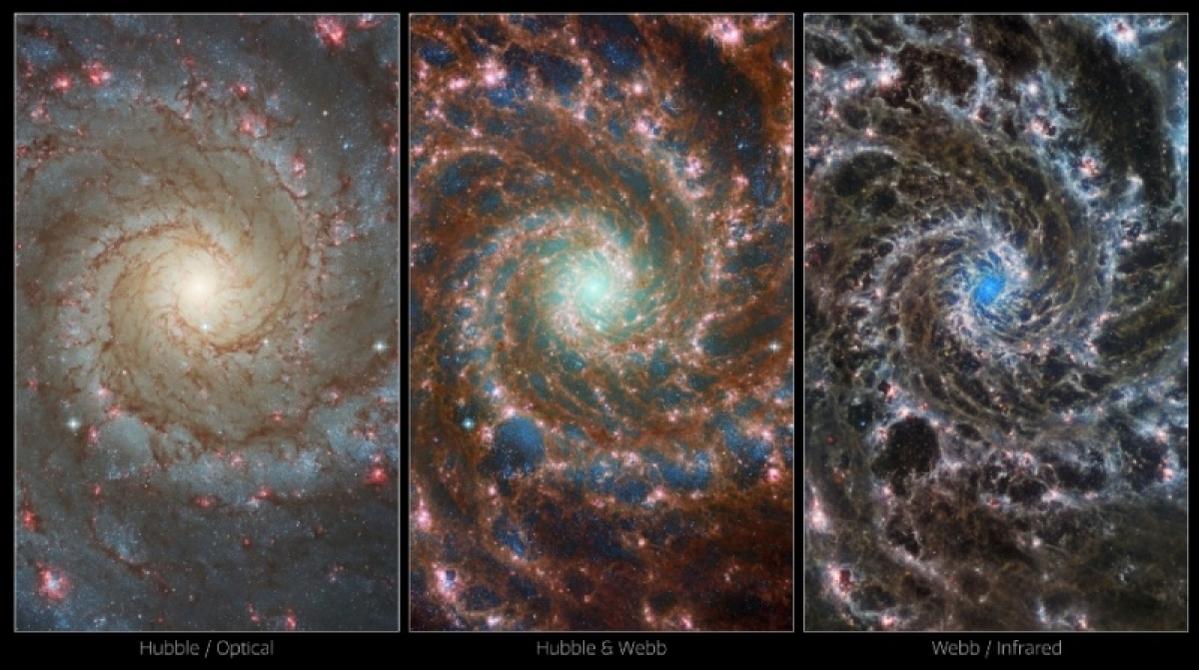 Trong khi kính viễn vọng Hubble chụp vũ trụ chủ yếu trong quang phổ ánh sáng nhìn thấy được, tiết lộ sự phân bố của các ngôi sao trong thiên hà, James Webb tập trung vào quang phổ hồng ngoại, phát hiện ra khí và bụi phát nhiệt tích tụ trong các nhánh xoắn ốc của thiên hà.