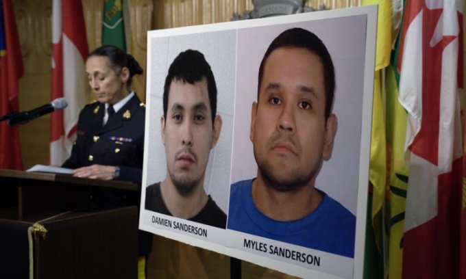 Ảnh của hai nghi phạm Damien Sanderson (trái) và Myles Sanderson trong cuộc họp báo tại trụ sở Cảnh sát Hoàng gia Canada ở Regina, Saskatchewan, hôm 4/9. Ảnh: AP.