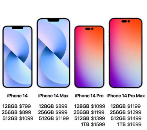 Theo nguồn tin trang ITBear, iPhone 14 tiêu chuẩn sẽ có tùy chọn bộ nhớ dung lượng 128 GB, 256 GB và 512 GB, với mức giá lần lượt 799 USD, 899 USD và 1.099 USD. iPhone 14 Max với các tùy chọn tương ứng sẽ có mức giá lần lượt là 899 USD, 999 USD và 1.199 USD