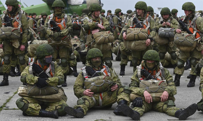 Lính đổ bộ đường không Nga tham gia diễn tập tại thành phố Taganrog tháng 4/2021. Ảnh: AP.