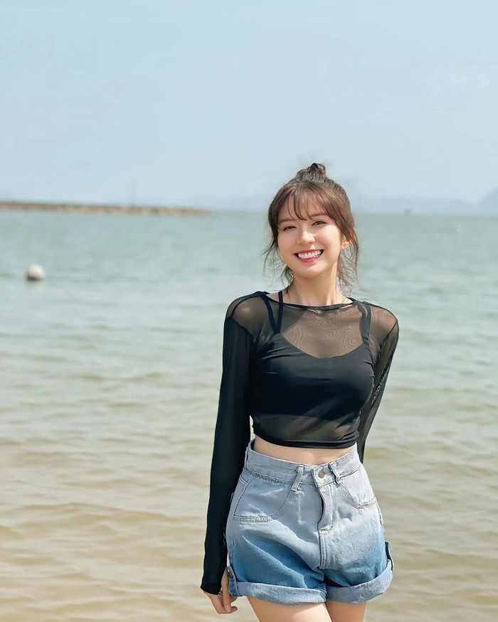 Theo đó, nàng "ba chấm" diện áo pull dài tay có chất liệu xuyên thấu kết hợp với quần sooc jean, tổng thể trang phục rất năng động và trẻ trung. Cùng với đó là khoảnh khắc nữ diễn viên khoe trọn những đường nét thanh tú trên gương mặt, với hàng chân mày lá liễu, sống mũi cao và đôi môi đỏ mọng.