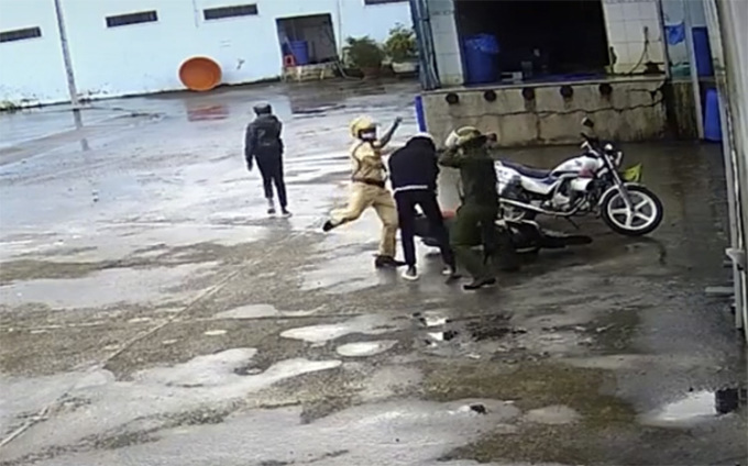 Đuổi theo phía sau là môtô chuyên dụng của CSGT, do người mặc cảnh phục CSGT cầm lái, chở một người mặc cảnh phục công an màu xanh. Khi xe của 2 thiếu niên dừng lại, xe CSGT cũng cặp sát. Người mặc đồ công an màu xanh liền nhảy xuống, dùng gậy, tay, chân, nón bảo hiểm đánh tới tấp thiếu niên cầm lái. Người mặc đồ CSGT cũng xuống đá, đấm em này.