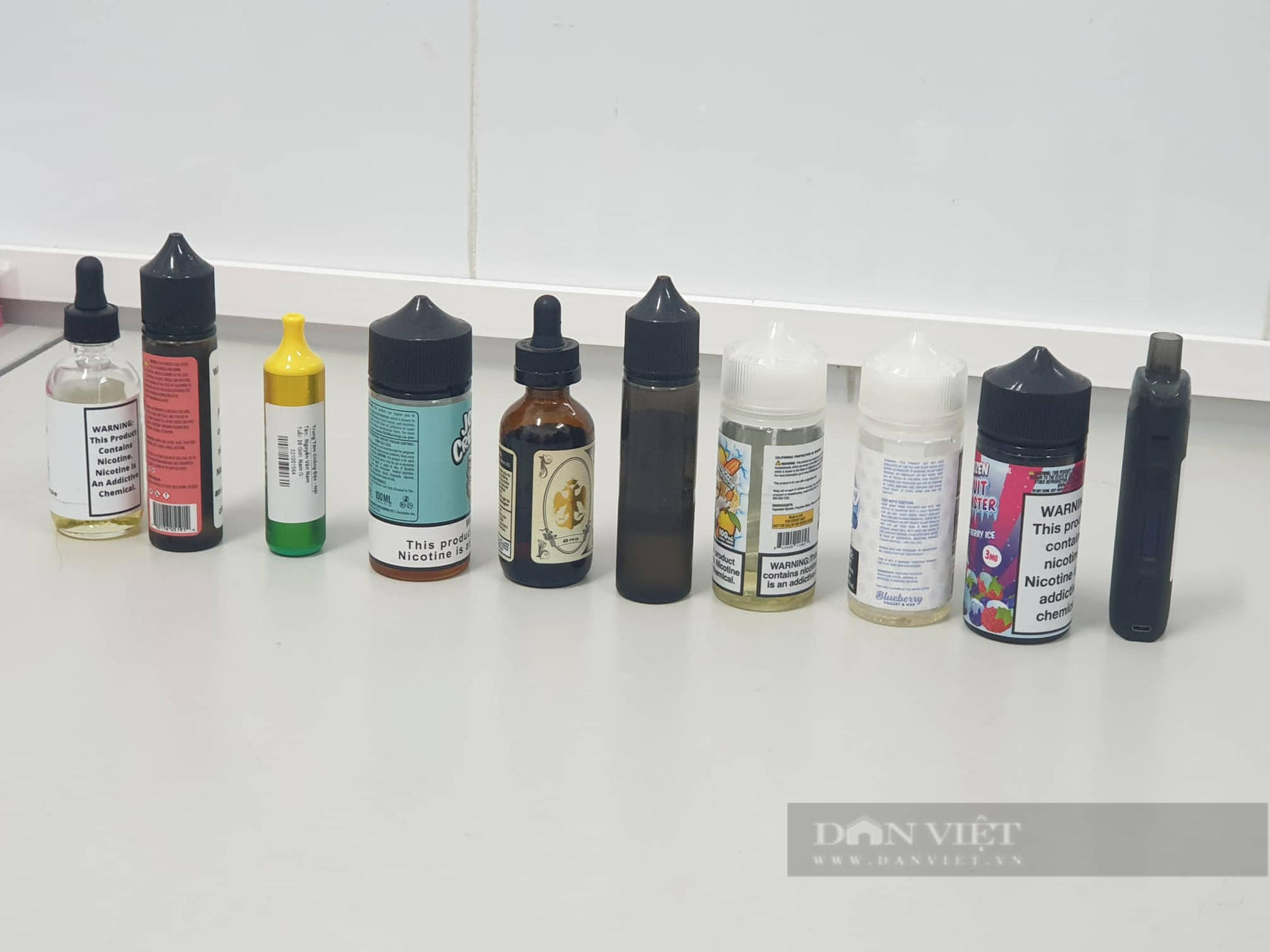 Những mẫu tinh dầu thuốc lá điện tử gây ngộ độc mà các bệnh nhân ngộ độc sau khi hút thuốc lá điện tử mang đến Trung tâm Chống độc (Bệnh viện Bạch Mai). Ảnh Diệu Linh