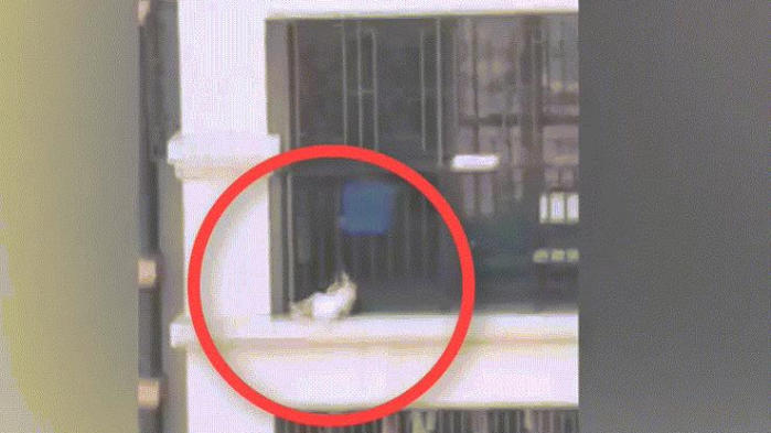Một người hàng xóm sau đó bất chấp nguy hiểm, trèo ra từ cửa sổ nhà mình, men theo mép tường để giải cứu đứa trẻ.