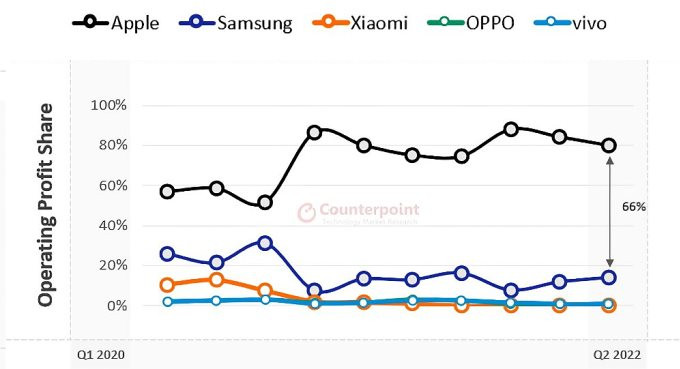 Apple đã chiếm tới 80% lợi nhuận của cả ngành điện thoại thông minh trong quý II năm 2022, bỏ xa vị trí thứ hai của Samsung tới 66 điểm phần trăm.