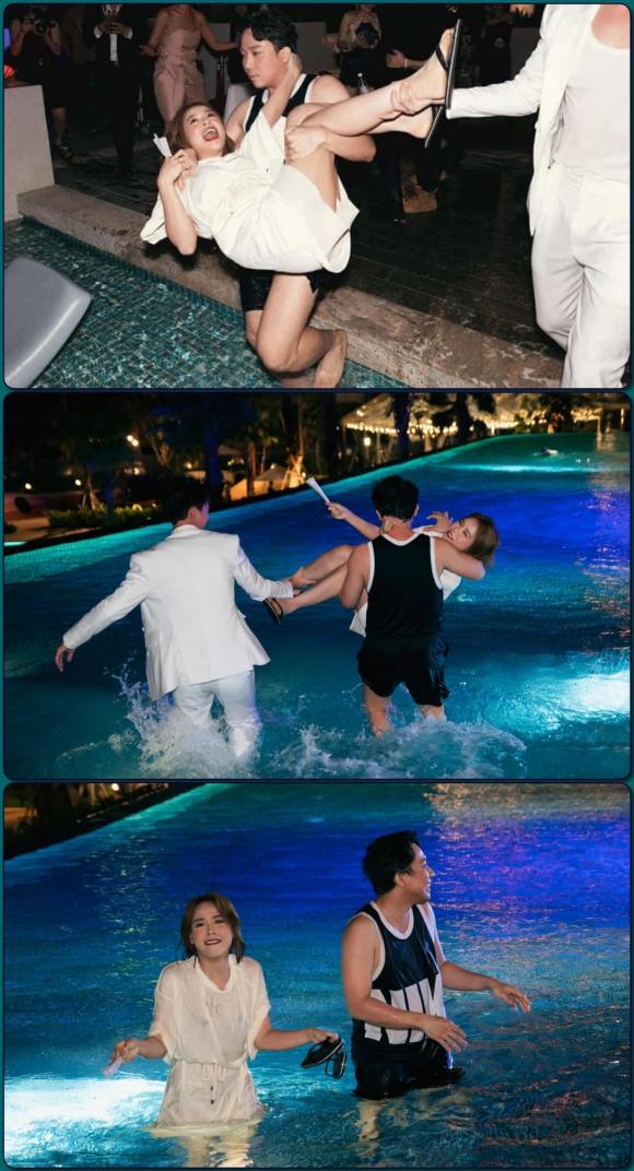 Ngay lúc này, Sam cũng vội vào trần tình với Hari Won rằng: "Chị Ri ơi khiêng kiểu này hông ham đâu. E sứt luôn cặp mi giả và uống mấy lít nước hồ bơi rồi á".