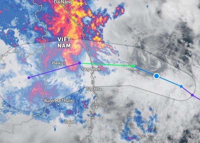 Bản đồ đường đi của bão số 5 và khu vực đang mưa lớn (màu đỏ và xanh). Ảnh: Zoom Earth.
