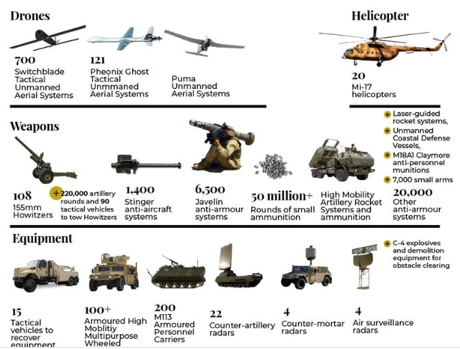 Các khoản viện trợ ấy bao gồm hàng trăm xe bọc thép, 142 cỗ lựu pháo 155 mm kèm 880.000 viên đạn pháo, hàng nghìn khẩu súng chống tăng Javelin và Stinger, và 60 triệu viên đạn.