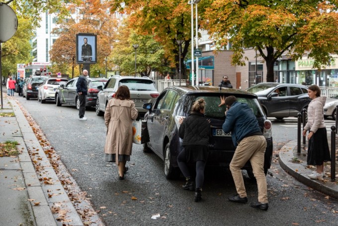 Người Pháp đẩy ôtô hết xăng khi đang xếp hàng chờ đổ tại một trạm xăng ở thủ đô Paris, ngày 14/10. Ảnh: AFP.