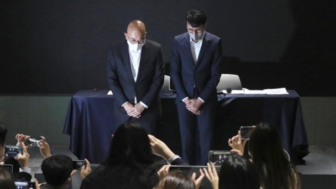 Các đại diện KakaoTalk cúi đầu xin lỗi sau sự cố. Ảnh: AP