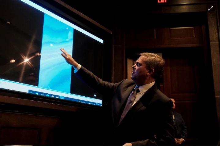Scott Bray, Phó giám đốc tình báo Hải quân Mỹ, trình bày video ghi lại UAP trước Ủy ban Tình báo Hạ viện Mỹ vào tháng 5. Ảnh: New York Times.