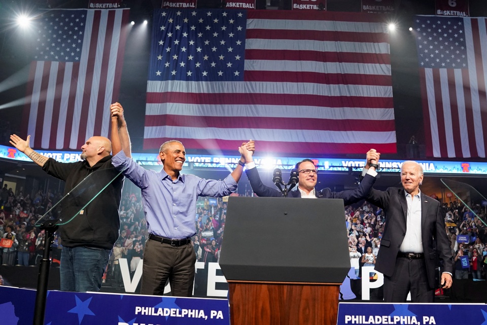 Từ phải sang, Tổng thống Joe Biden, ứng viên thống đốc Josh Shapiro, cựu Tổng thống Barack Obama, ứng viên Thượng viện John Fetterman tại buổi vận động của đảng Dân chủ ở Philadelphia, bang Pennsylvania ngày 5/11. Ảnh: Reuters.