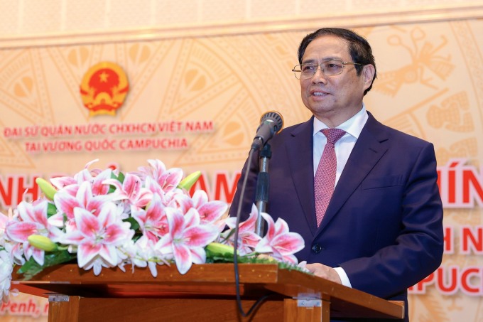 Thủ tướng Phạm Minh Chính phát biểu trong buổi nói chuyện ở Đại sứ quán Việt Nam cùng kiều bào tại Campuchia chiều 9/11. Ảnh: Nhật Bắc/VGP.