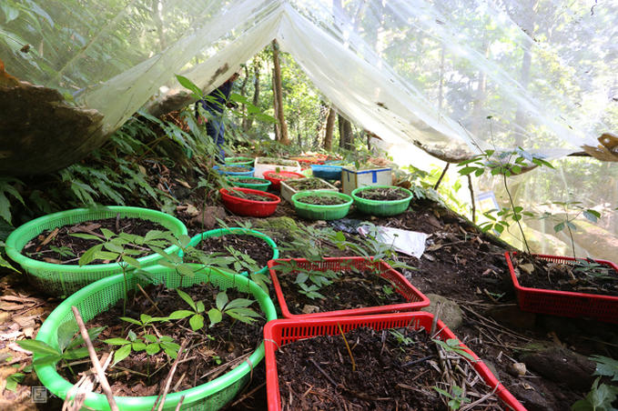 Sâm Ngọc Linh làm thành luống nhưng được người dân thu gom mùn về bỏ vào thùng nhựa trồng. Ảnh: Đắc Thành