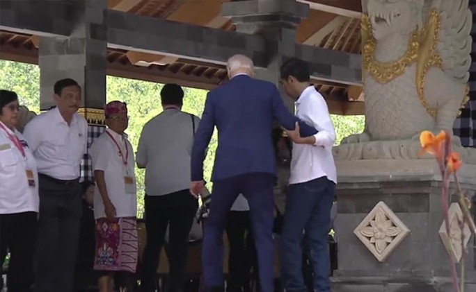 Vụ việc xảy ra trong lúc 2 nhà lănh đạo thăm rừng ngập mặn Taman Hutan Raya ở Bali. Tổng thống Biden trượt chân và được Tổng thống Widodo đỡ kịp thời.