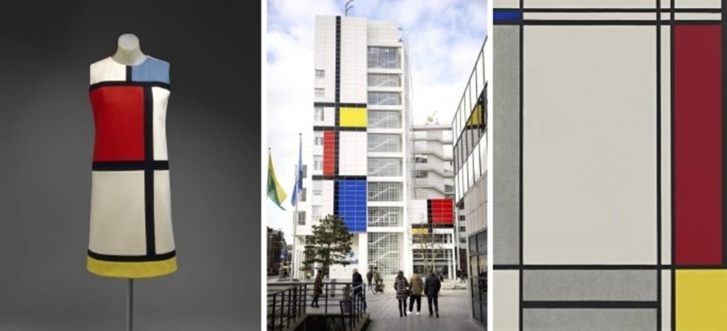 Từ trái qua: Váy của Yves Saint Laurent, Tòa thị chính Hague (Hà Lan), bức "Non-Objective" của Roy Lichtenstein đều lấy cảm hứng từ tác phẩm của Piet Mondrian. Ảnh: Sotheby's