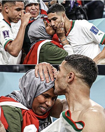 Sau trận đấu, hậu vệ Achraf Hakimi xúc động tiến về chỗ mẹ, người đang khoác quốc kỳ Morocco, trên khán đài. Anh cởi áo đấu trao cho mẹ và hôn lên trán bà.