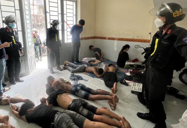 Tại đây, công an đã bắt quả tang 8 đối tượng gồm Nguyễn Vũ Phong (thường gọi Phong Max, 25 tuổi, quê tỉnh Cà Mau); Trương Jhon Ny (thường gọi Nam Ka, 22 tuổi, ngụ TP.HCM); Ngô Minh Khoa (23 tuổi, quê tỉnh Long An); Trần Tuấn Khải (23 tuổi, quê tỉnh Sóc Trăng); Quách Văn Quang (17 tuổi, ngụ huyện Vĩnh Cửu, tỉnh Đồng Nai); Lê Thị Nguyệt Nhi (thường gọi Bi, 18 tuổi, ngụ TP.Biên Hòa, Đồng Nai); Mai Trung Hiếu (16 tuổi, ngụ TP.Biên Hòa) và Trần Quốc Tuấn (16 tuổi, ngụ TP.Biên Hòa) đang có hành vi giam giữ người trái pháp luật.