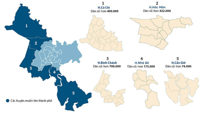 5 huyện ở TP HCM muốn lên thành phố. Đồ họa: Khánh Hoàng