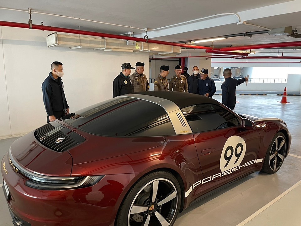 Cảnh sát thu giữ một chiếc Porsche và những chiếc xe sang khác trong các cuộc đột kích ở Bangkok và Samut Prakan. Ảnh: Irrawaddy.