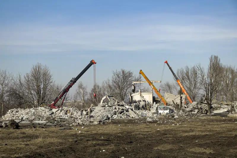 Công nhân dọn dẹp đống đổ nát sau cuộc tấn công bằng tên lửa của Ukraine vào Makiivka, thuộc vùng Donetsk do Nga kiểm soát ngày 3 tháng 1 năm 2023. Ảnh AP