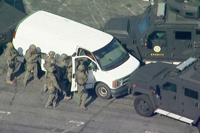 Hiện chưa xác minh được người ở trong xe tải có phải là nghi phạm hay không, theo ABC7.Nhiều nguồn tin từ giới chức nói với Los Angeles Times rằng tài xế chết do một tự bắn. Ít nhất hai vết đạn được nhìn thấy trên cửa sổ chiếc xe ít phút trước khi cảnh sát lại gần xe. Cảnh sát trưởng hạt Los Angeles Robert Luna nói tại họp báo rằng giới chức nghĩ rằng người trong xe có thể là nghi phạm, nhưng họ chưa xác nhận. Ảnh: Reuters.