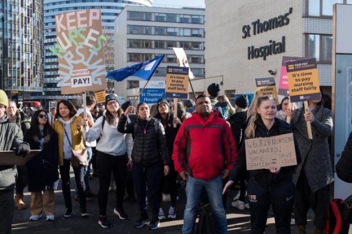 Các y tá và người ủng hộ họ tuần hành bên ngoài Bệnh viện St Thomas, London, Anh, hôm 6/2. Ảnh: AFP